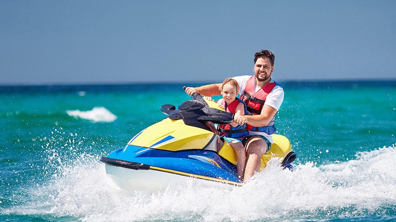 Jet ski[dʒetskiː]:A small machine like a motorcycle that is powered by a jet engine and can travel on the surface of water. (水上摩托艇、喷气式滑艇)